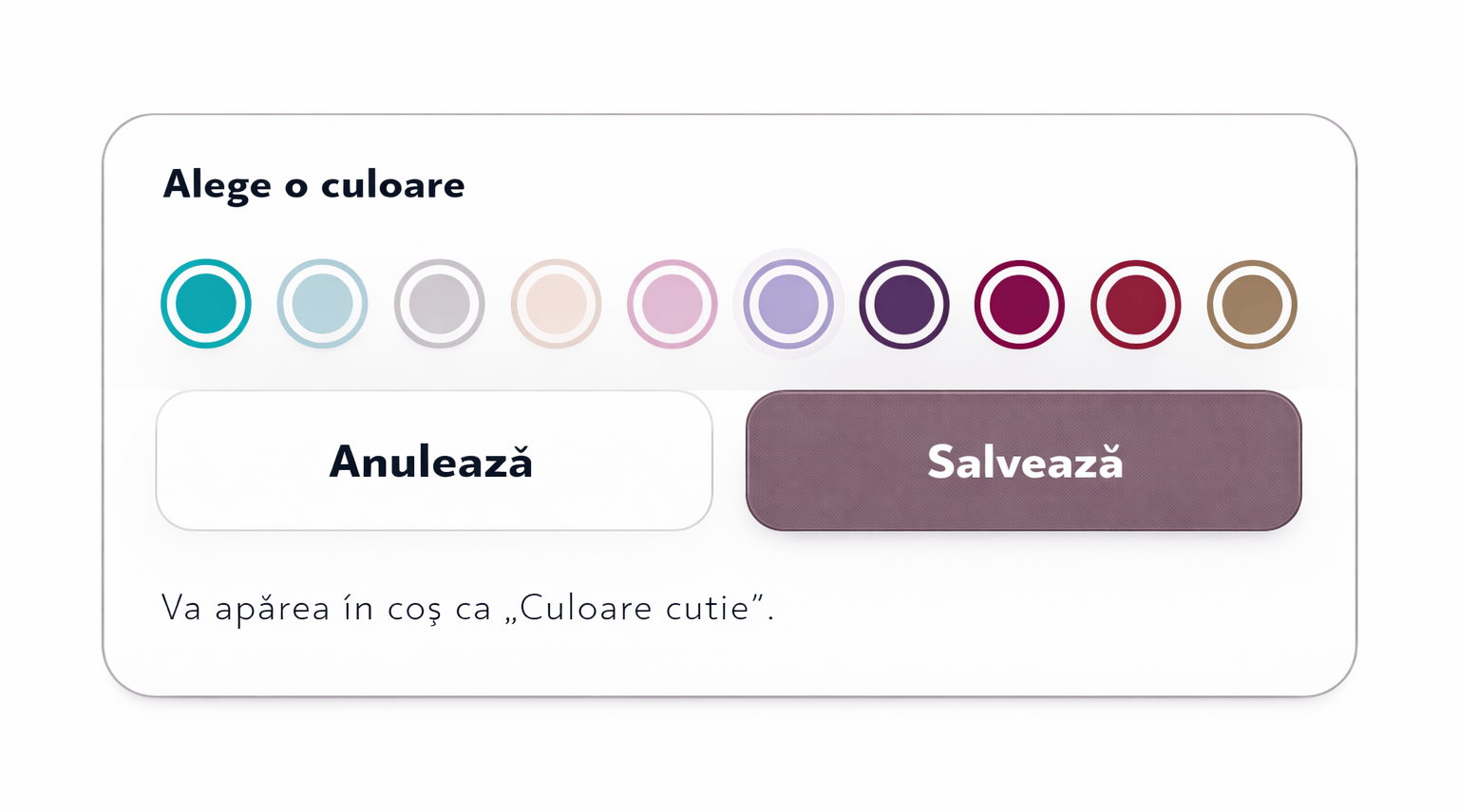 Pe pagina fiecărui produs ai acum un selector de culoare, cu actualizare în timp real, astfel încât să vezi imediat cum arată cutia în varianta aleasă. Personalizează ambalajul exact așa cum îți dorești.